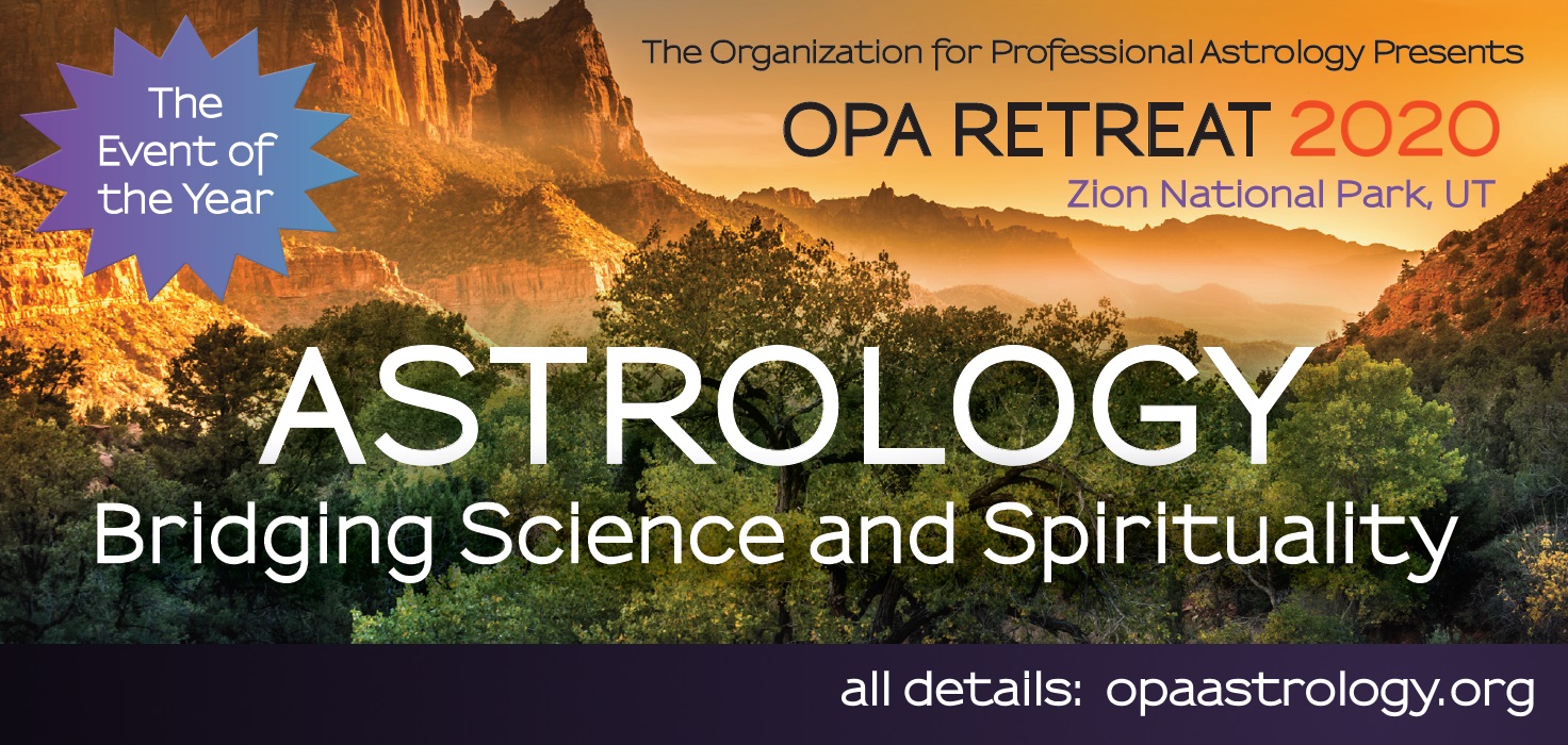 April 23-26, 2020 | OPA Retreat 2020 Zion National Park April 23-26, 2020 Welcome to the 2020 Retreat. We are delighted to have a very unique and eclectic selection of Tracks this year, from Predictive, to Traditional, to Evolutionary, and much more. You will immerse yourself in the track you choose for 3 days of the retreat in an intimate group of maximum 12 people, This is a unique way to dive deeper into the material. Christopher Renstrom Track 5. CHRISTOPHER RENSTROM Jupiter and Saturn: the two faces of Fortune (Natal and Transit) Ahead of the 2020 conjunction, we look at Jupiter and Saturn as two sides of the same coin. One represents "the hand that giveth" while the other is generally seen as "the hand that taketh away". But there's more [...]